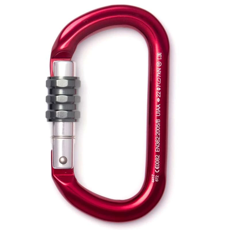 - Mosquetón simétrico, de forma ovalada y con cierre de seguridad de rosca.