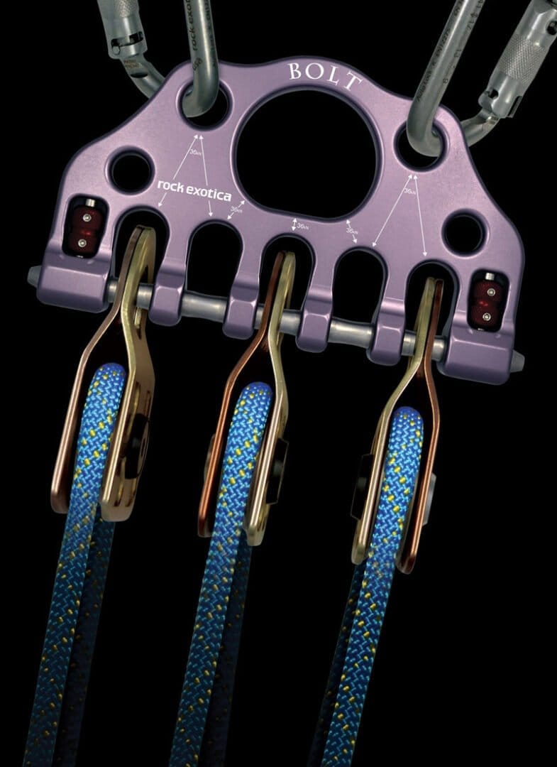 La placa de anclaje BOLT utiliza una varilla o “perno” de acero inoxidable de desmontaje rápido que le permite conectar su equipo directamente a los cinco puntos de conexión sin usar mosquetones. El resultado es una conexión más limpia y, cuando se trata de poleas, un uso más eficiente del espacio cuando se alinean una al lado de la otra que cuando se utiliza una placa de aparejo tradicional.