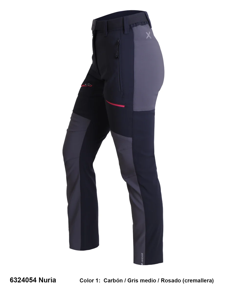 Descripción: Cintura semi-elástica con cierre de botón a presión y cinturón elástico ajustable, cuatro bolsillos con cremalleras, pinzas en las rodillas, cinta para fijar el cordón del calzado, logos reflectantes.