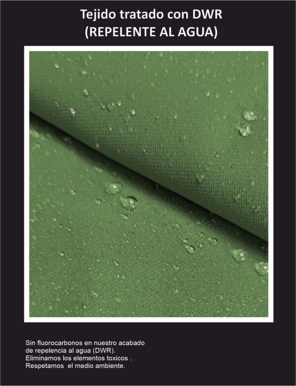 Prestaciones: Tejido elástico tratado con DWR que repele el agua, corta el viento, transpirable.