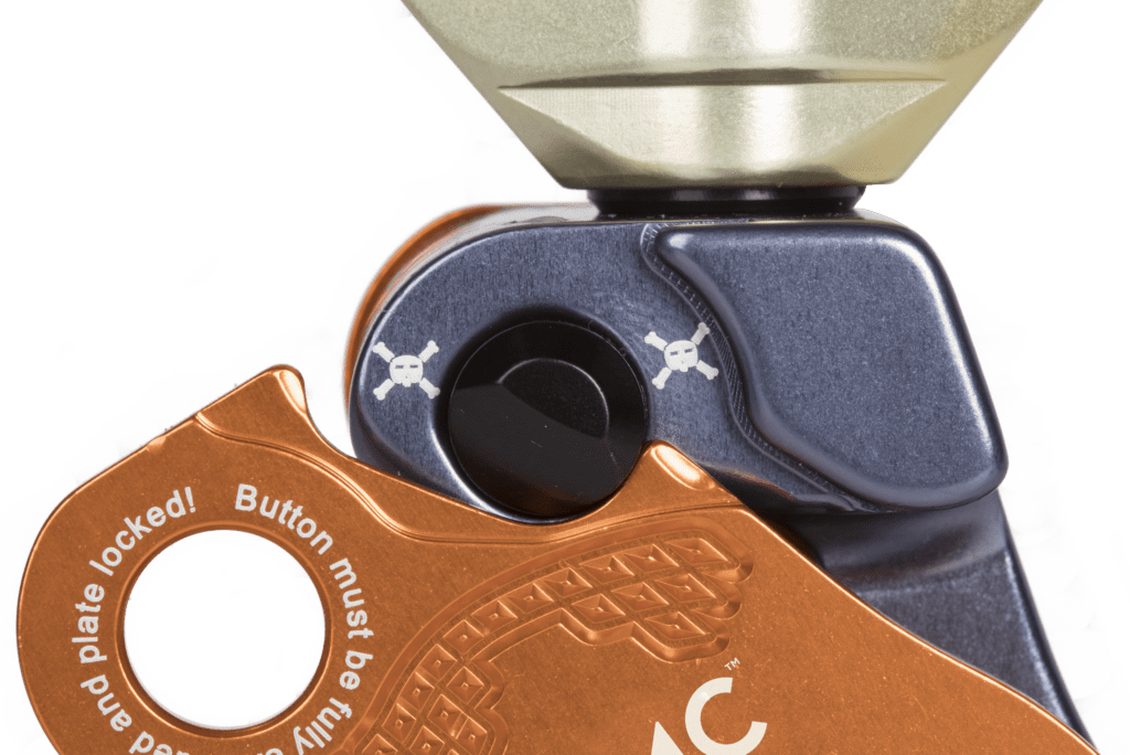 La placa lateral pivotante permite cargar la cuerda sin desconectarse del ancla