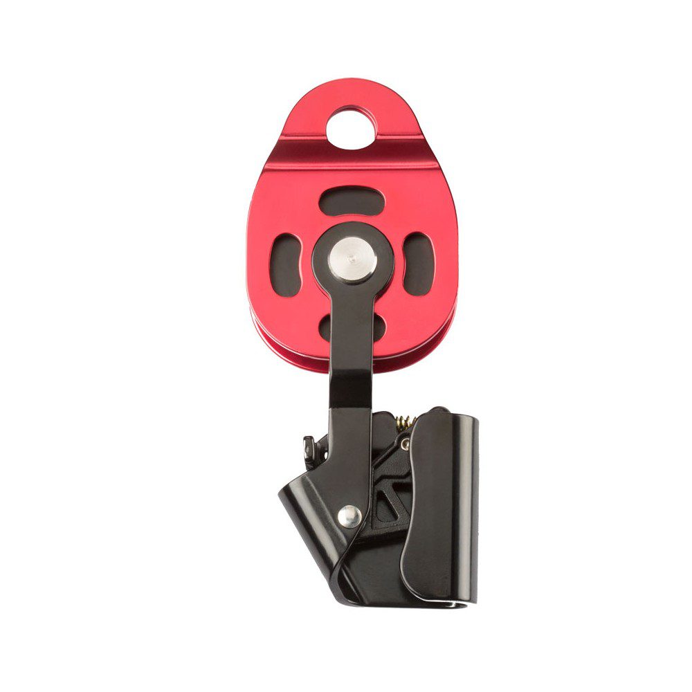Polea simple de placas oscilantes diseñada para poder instalar la cuerda cuando la polea está fijada al anclaje.