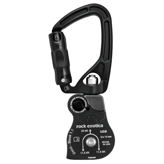 El Omni-Block SwivaBiner combina un mosquetón giratorio y una polea en una sola herramienta e incorpora una placa lateral única que se abre mientras la polea todavía está unida al anclaje.