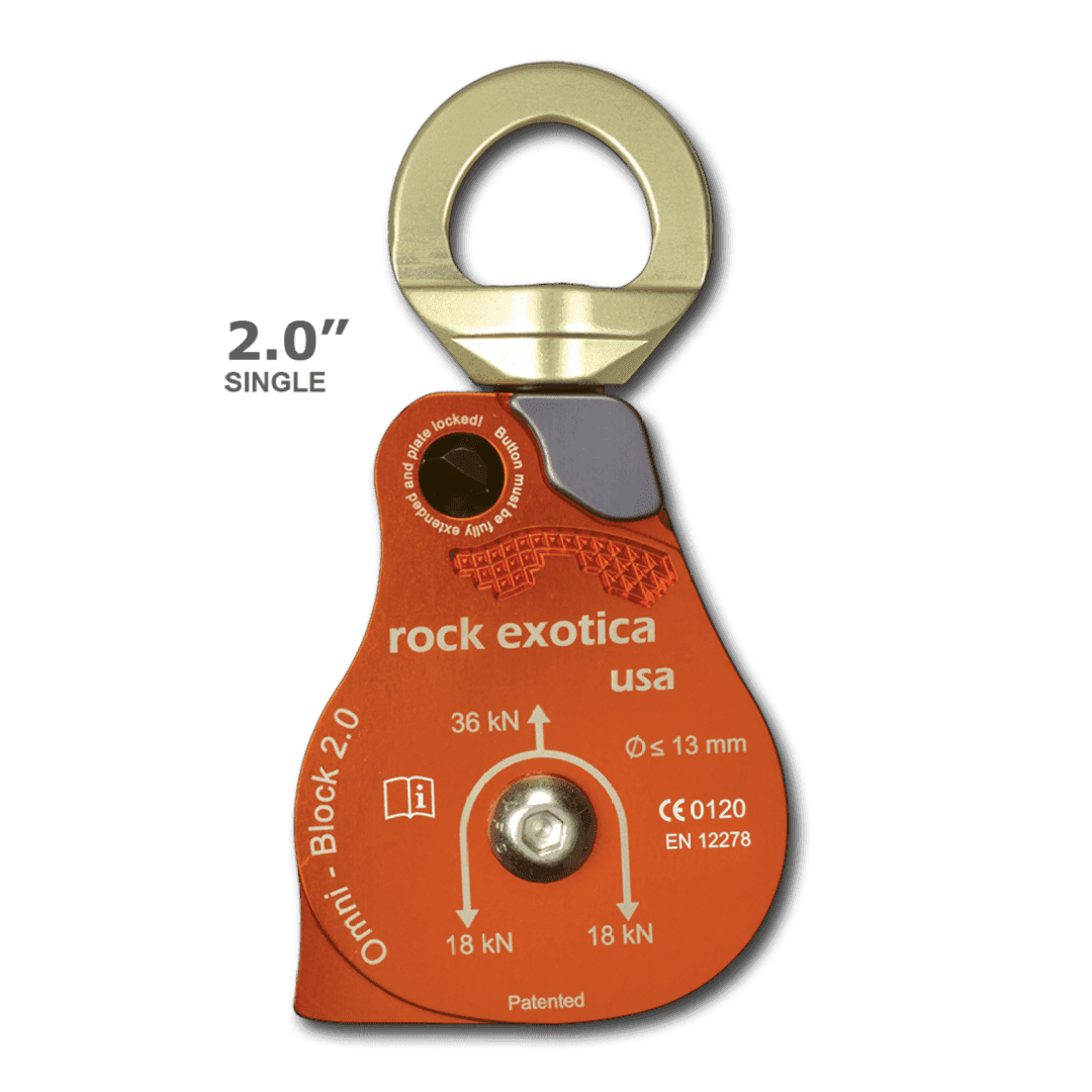 El Omni-Block combina un eslabón giratorio y una polea en una sola herramienta e incorpora una placa lateral única que se abre mientras la polea está sujeta al anclaje. Tradicionalmente, la polea se conecta al eslabón giratorio mediante un mosquetón. Sin embargo, el Omni elimina la necesidad del mosquetón, reduciendo la longitud y el número de piezas en el sistema de aparejo. La corta longitud del Omni es importante cuando se utiliza en ángulos pronunciados, espacios reducidos u otros entornos de aparejo con espacio limitado. Su peso reducido facilita el izado del equipo. Además, la placa lateral del Omni se puede abrir sin separarla del mosquetón. Las poleas tradicionales requieren desmontar el mosquetón para cambiar la cuerda. Con el Omni, el usuario puede hacerlo mientras la polea está sujeta.