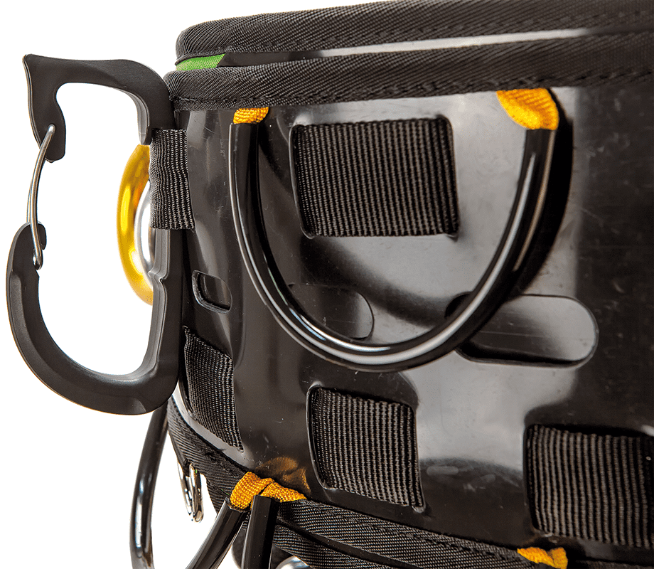 El interior del mosquetón está adaptado para la fijación con una correa de arnés lateral y algunas mochilas.