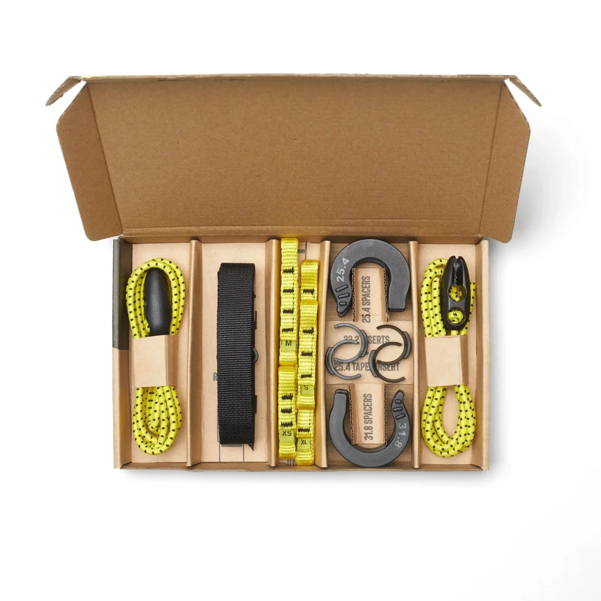 Jack te permite llevar más cosas en la bici. No requiere herramientas para colocarlo y se fija con seguridad a bicicletas con un diámetro de manillar de 22,2, 25,4 y 31,8 mm. Se monta y desmonta rápida y fácilmente, por lo que puedes cambiarlo de una bicicleta a otra. Echa un vistazo a los diagramas de compatibilidad para asegurarte de que Jack se adapta a tu bicicleta antes de comprarlo. JACK está fabricado en acero inoxidable 304 macizo y se suministra con dos correas elásticas de longitud ajustable (1,2 m) con cabezas de serpiente para asegurar tu equipaje, un montón de separadores e insertos y 5 correas de carga de longitud diferente para ajustar JACK a tu Bici.