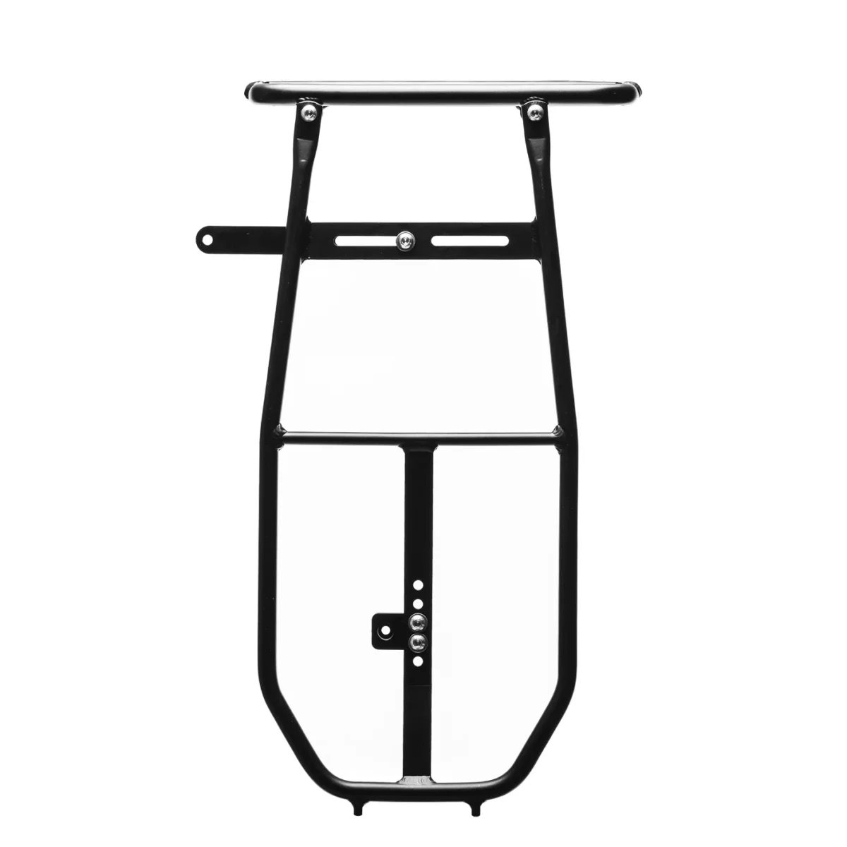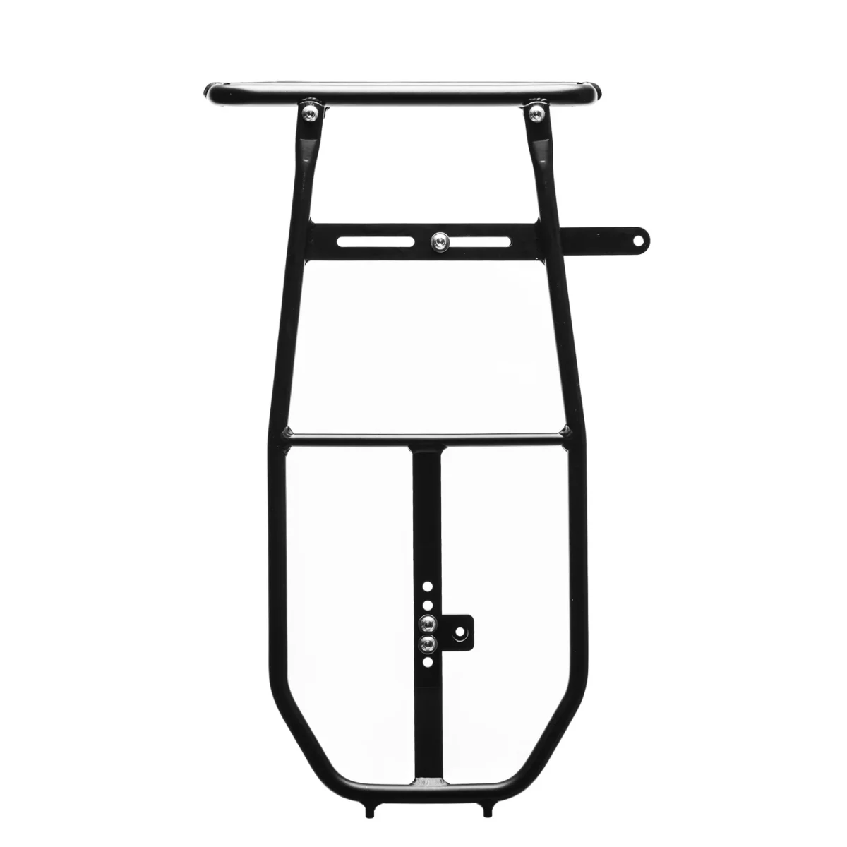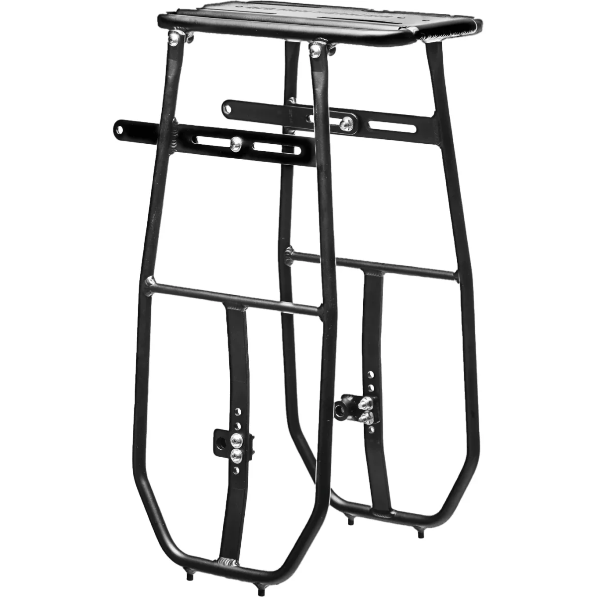 Este portabultos combina raíles laterales extra bajos para alforjas con una plataforma superior para equipaje adicional, permitiendo llevar bolsas, cajas o equipo extra sin interferir con el manillar ni afectar la dirección de la bicicleta.
