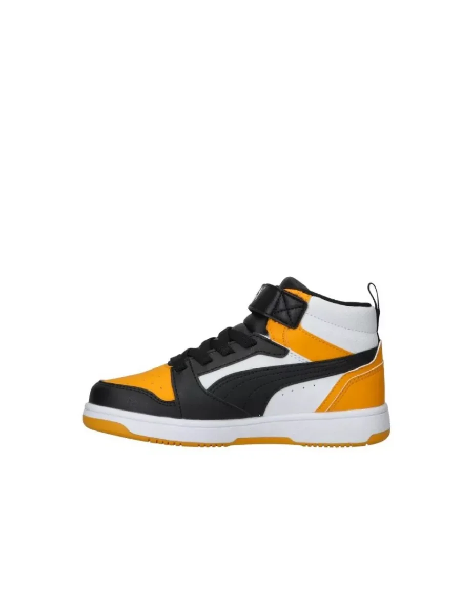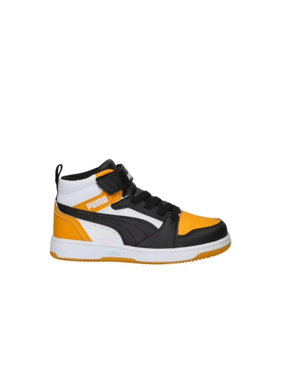 Descubre el botín deportivo PUMA Rebound V6 Mid para niño, un calzado de media caña en blanco negro y amarillo, ideal para actividades deportivas y casuales. Con cierre de cordones y velcro para un ajuste seguro y suela de gran tracción.