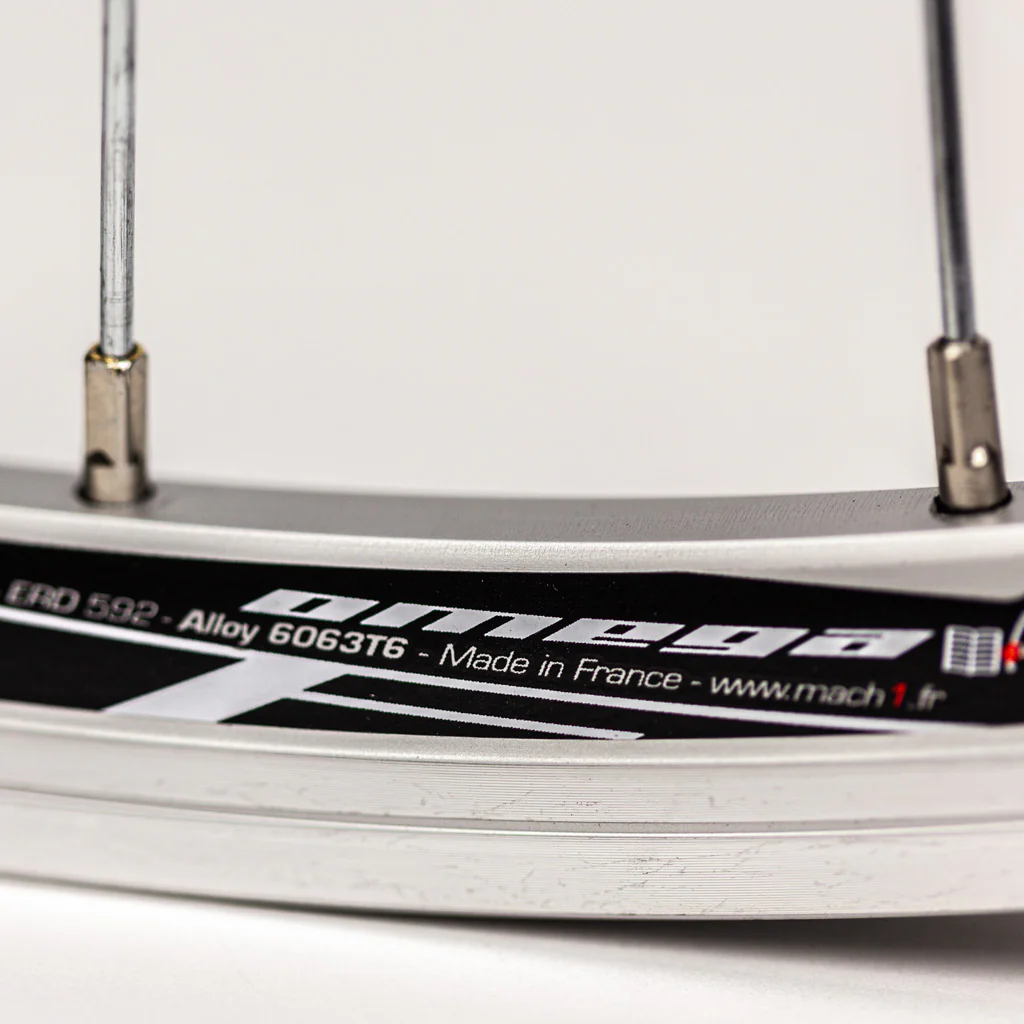 La llanta semi-perfilada con aro de aluminio, está equipada con un buje de  cierre rápido de 100 mm y 36 radios de acero galvanizado. Esta es una llanta para frenos de zapata. Con un peso contenido de 1000 gramos.