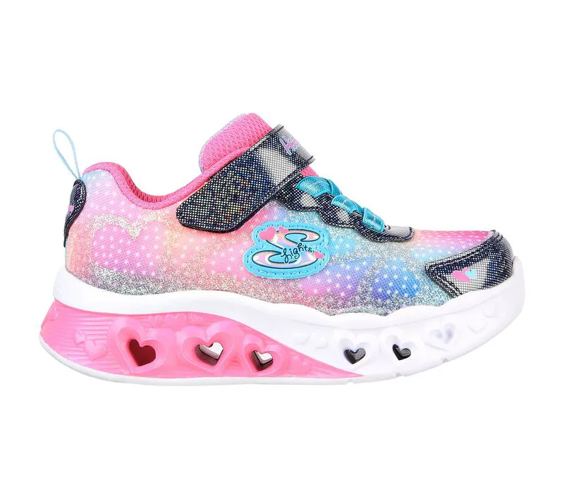 Ilumina cada paso de los más peques con un estilo lleno de corazones usando estas Skechers Flutter Heart Lights Simply Love. Esta zapatilla sin cordones, es muy ligera y tiene una parte superior de tela con un estampado degradado y una capa de corazón con purpurina sintética, además, de una entresuela iluminada con forma de corazones en 3D. Cuenta con un velcro y un botón de encendido/apagado para las luces.