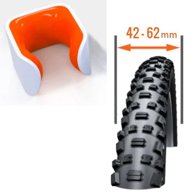 El modelo MTB está diseñado para neumáticos de bicicleta de montaña con una sección entre 43 mm y 57 mm (1,8 pulgadas y 2,25 pulgadas). Puede soportar hasta 20 kilos de carga
